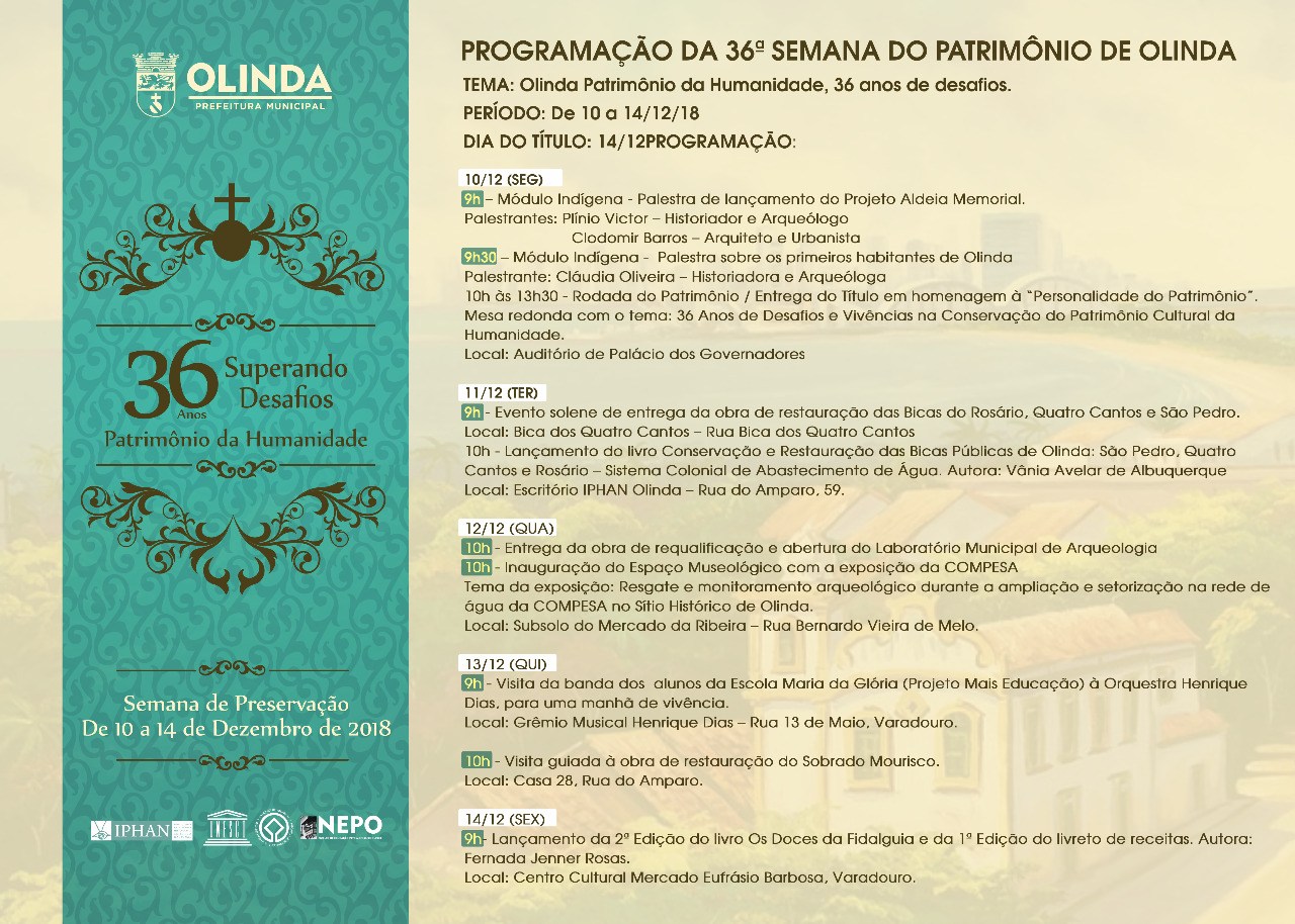 A 36ª Semana do Patrimônio de Olinda começou nesta segunda-feira (10.12) e segue até a próxima sexta-feira (14.12) com uma programação voltada para a preservação de um bem de toda humanidade: a nossa História. Amanhã, às 9h, serão entregues restauradas as bicas de São Pedro, Rosário e Quatro Cantos, no Sítio Histórico. A cerimônia acontecerá na Bica dos Quatro Cantos.