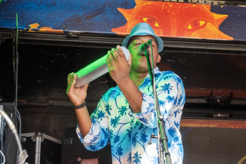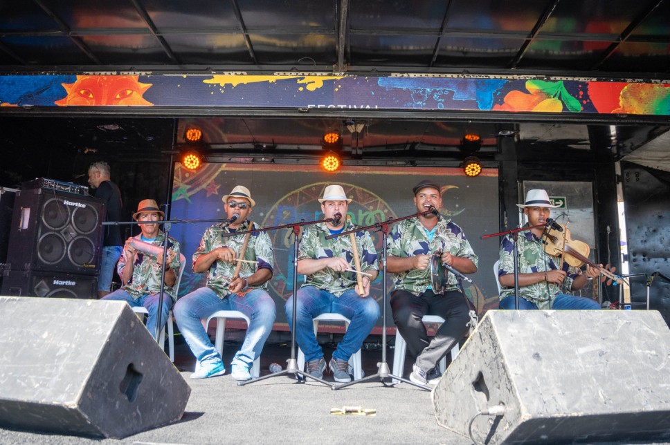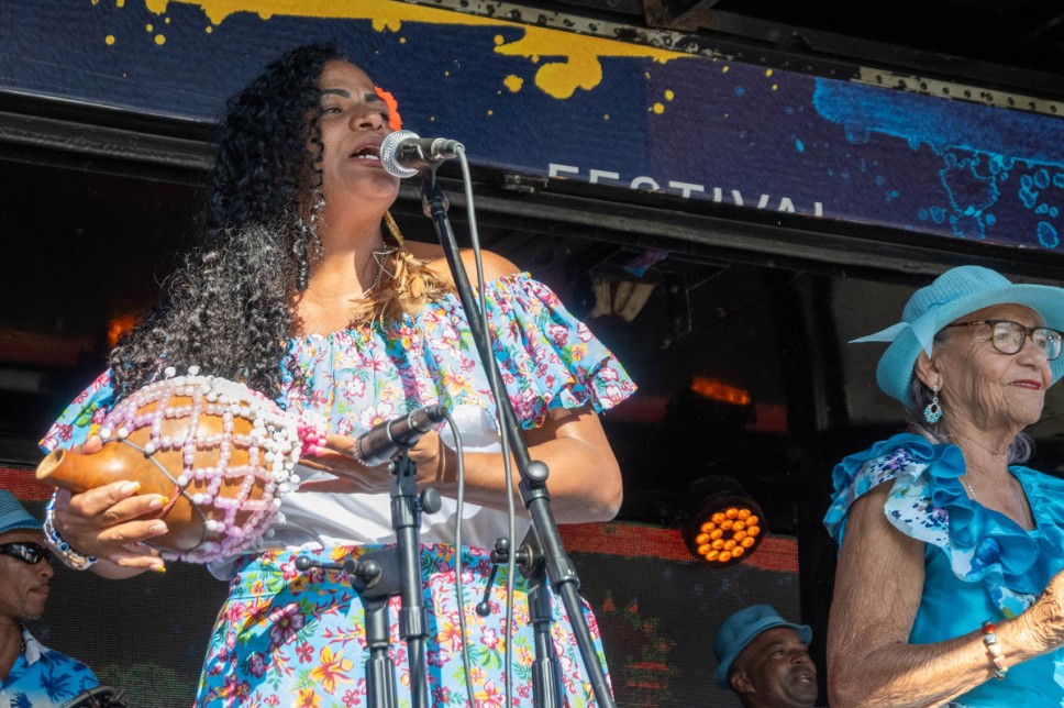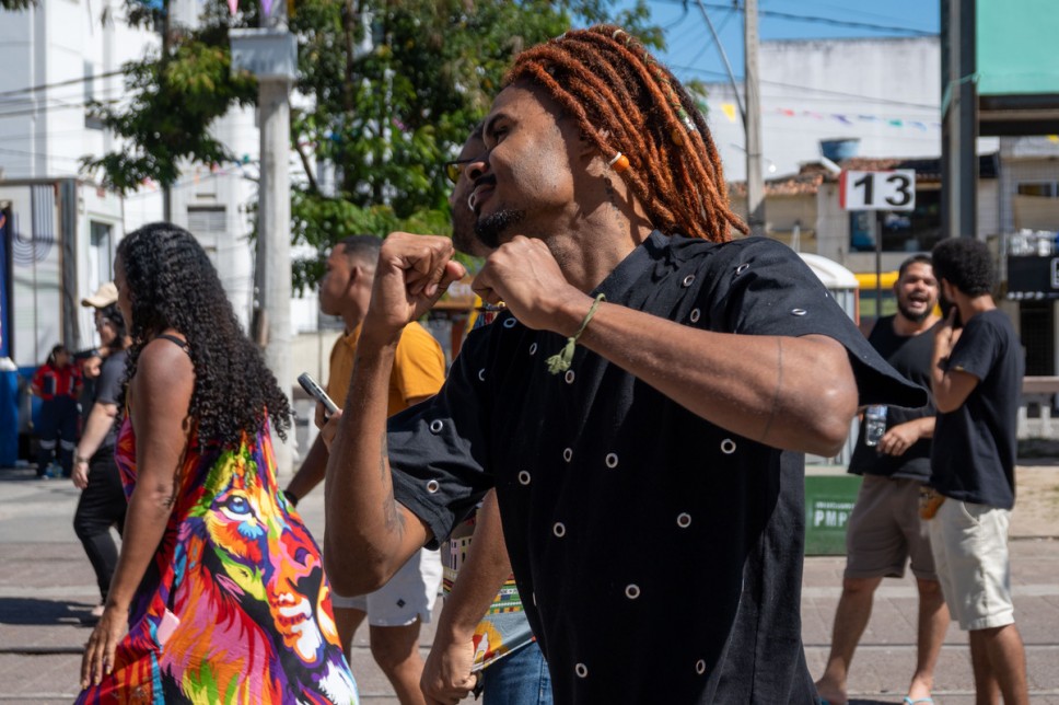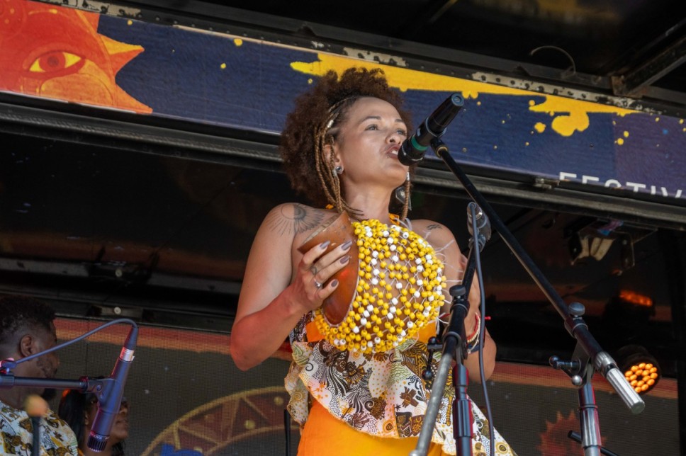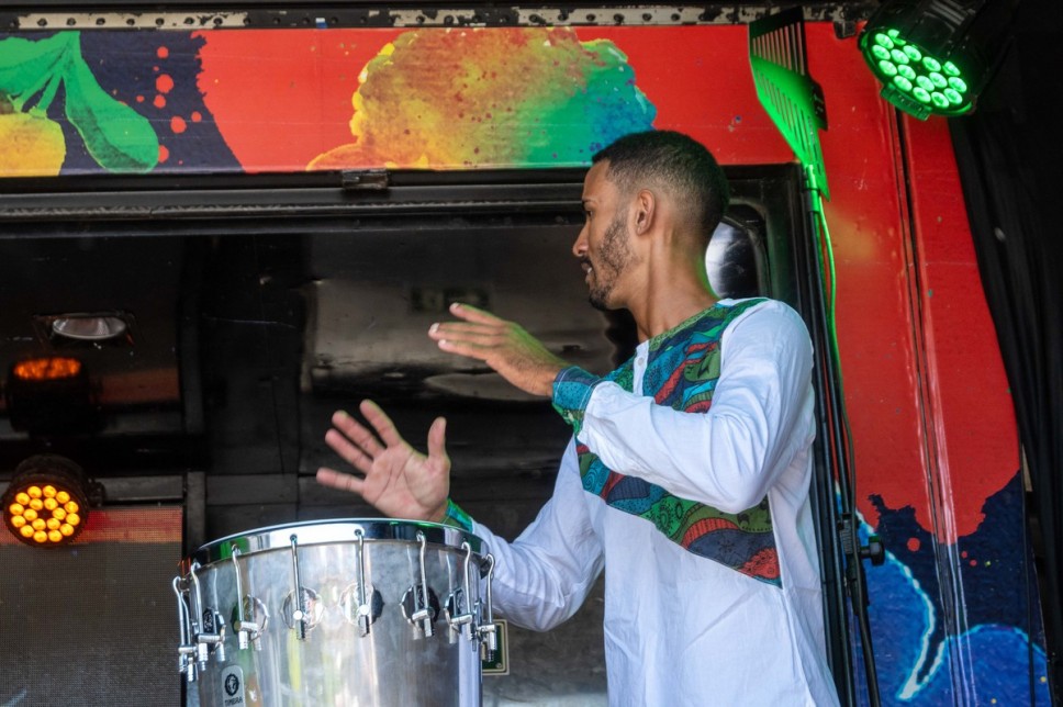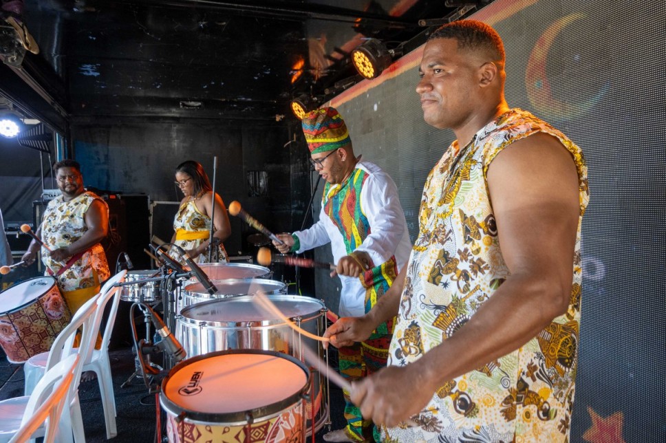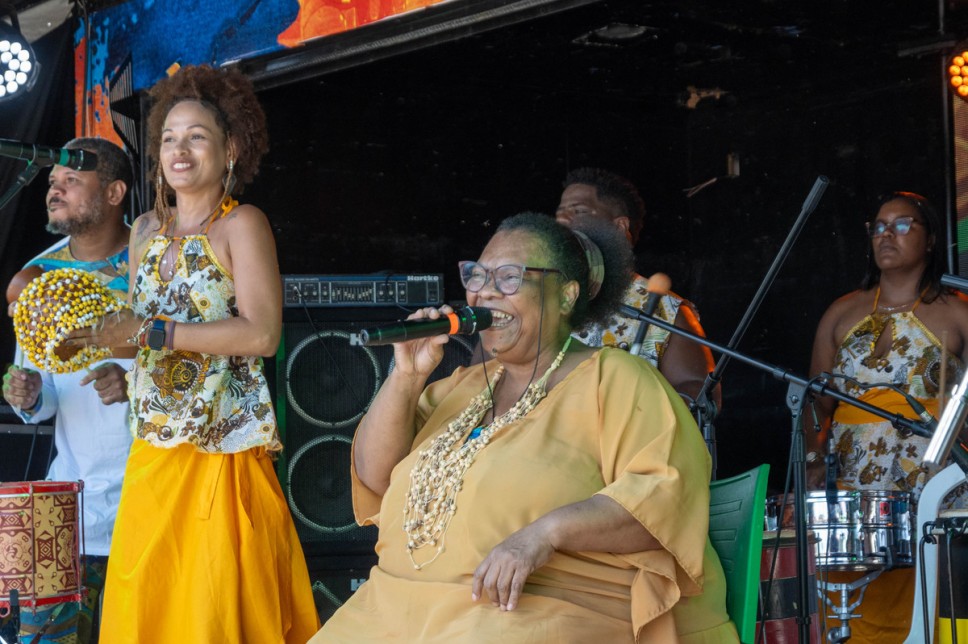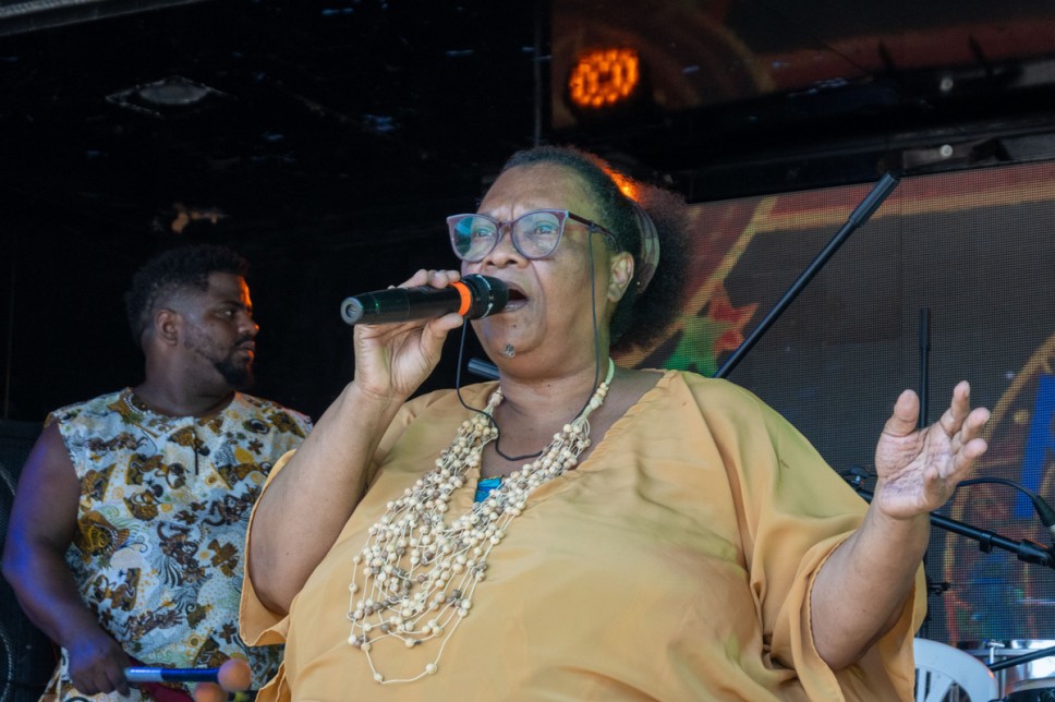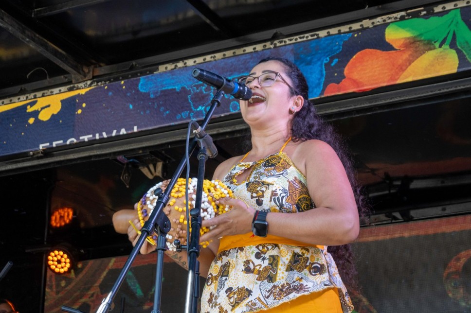 Formado há 38 anos, o Raízes do Quilombo é um dos vários grupos que reverenciam a ancestralidade de matriz africana e que têm dado o recado no festival pelos municípios em que passam. Segundo Dona Conceição (mãe do percussionista Lucas dos Prazeres), seus integrantes, cantores e percussionistas, são agentes multiplicadores. Contra o racismo (“O racismo existe/ não é mimimi”, canta contudentemente em seus versos) e em prol da conscientização e da resistência sociocultural e do protagonismo da mulher, em especial a preta e periférica, na sociedade. Aqui ainda prestou uma homenagem a Zé Neguinho do Coco.