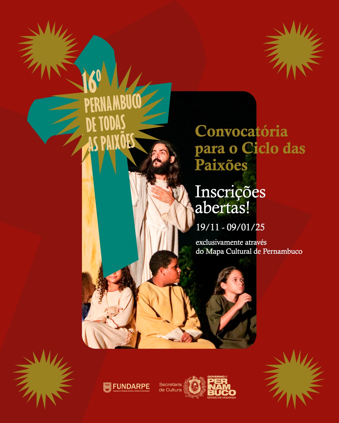 O 16º Pernambuco de Todas as Paixões tem como objetivo selecionar e apoiar projetos culturais de espetáculos cênicos que celebrem histórias e tradições cristãs, contribuindo para o fortalecimento das artes cênicas e o desenvolvimento de sua cadeia produtiva em Pernambuco. Com a seleção de propostas inovadoras e de qualidade, o concurso busca expandir a presença de espetáculos teatrais, em diversos municípios do Estado, possibilitando que a população tenha acesso a apresentações artísticas que valorizam o patrimônio cultural e a religiosidade local.