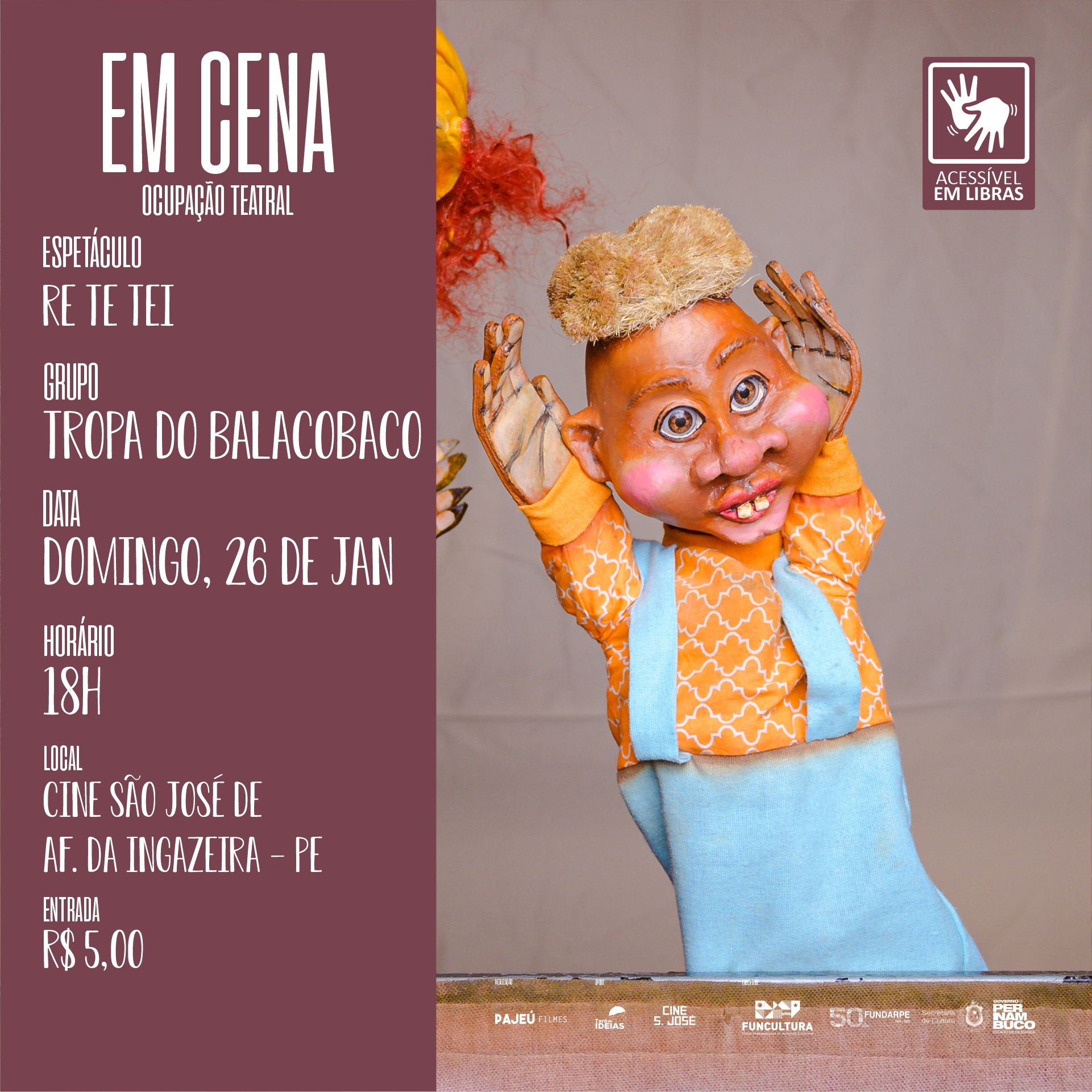 Encerrando a programação de férias no Cine São José, no município de Afogados da Ingazeira (Sertão), o projeto Em Cena: Ocupação Teatral no Cine São José faz sua última apresentação com o espetáculo Re Te Tei, da Tropa do Balacobaco, de Arcoverde (Sertão). A apresentação acontece este domingo (26), às 18h, com entrada ao preço único de R$ 5. A bilheteria abre às 17h30. A apresentação também conta com intérprete de libras.