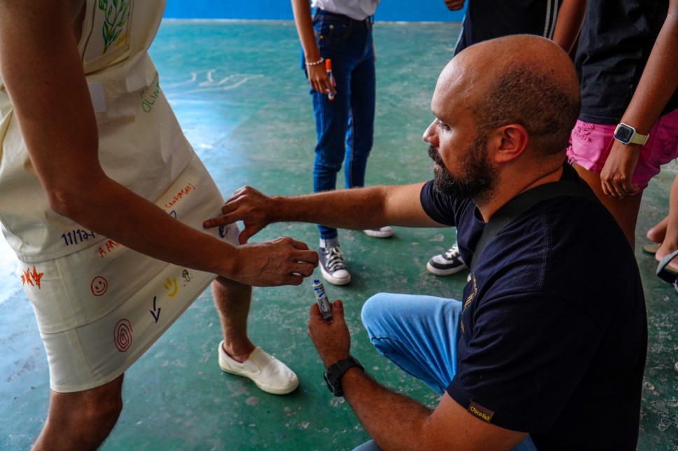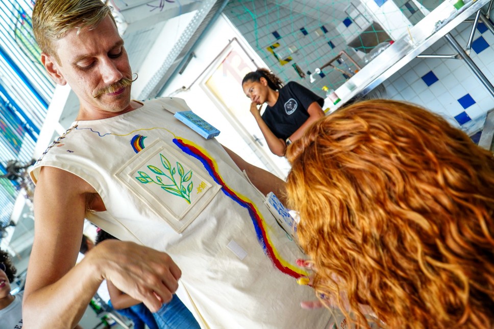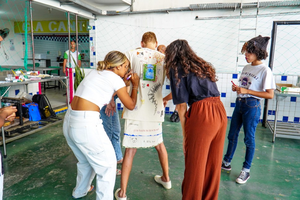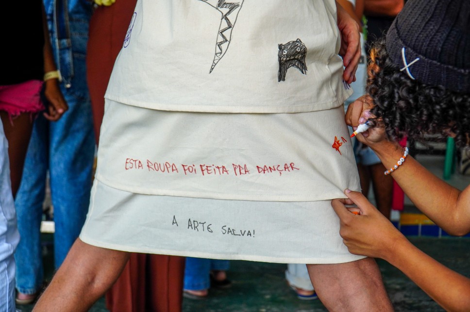 A performance “Tela Viva” transcendeu o caráter contemplativo, convidando os participantes a realizarem uma intervenção direta no figurino de Cadu. Munidos de materiais de pintura para tecido (pincéis, tintas e canetas), os espectadores tiveram uma hora para estampar livremente o que desejavam na peça. O figurino apresentou-se inicialmente como uma tela em branco, evoluindo gradativamente, resultando em uma obra final que é um testemunho da criatividade compartilhada e da interação dinâmica entre o artista e o ambiente acadêmico.