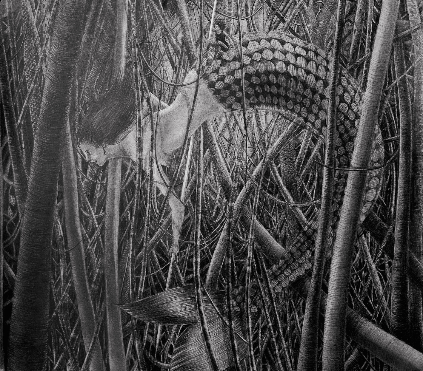 Na mostra CURAMATA, Juliana apresenta 19 obras em grafite, pastel seco, pastel à óleo e lápis de cor. Desenhos resultados de um processo artístico que mergulhou entre o ‘mundo natural’ e aspectos que caracterizam a identidade, a vocação, a sina das pessoas. “É uma ode ao estado de alerta e fluidez em que nos colocamos quando nos despimos de valores e dogmas sociais que são ausentes num contexto selvagem. Num mergulho dentro de si, uma sereia da mata viaja pelos infernos e limbos internos, até se encontrar numa selva sombria e calma, a consciência de si”, apresenta o texto curatorial.