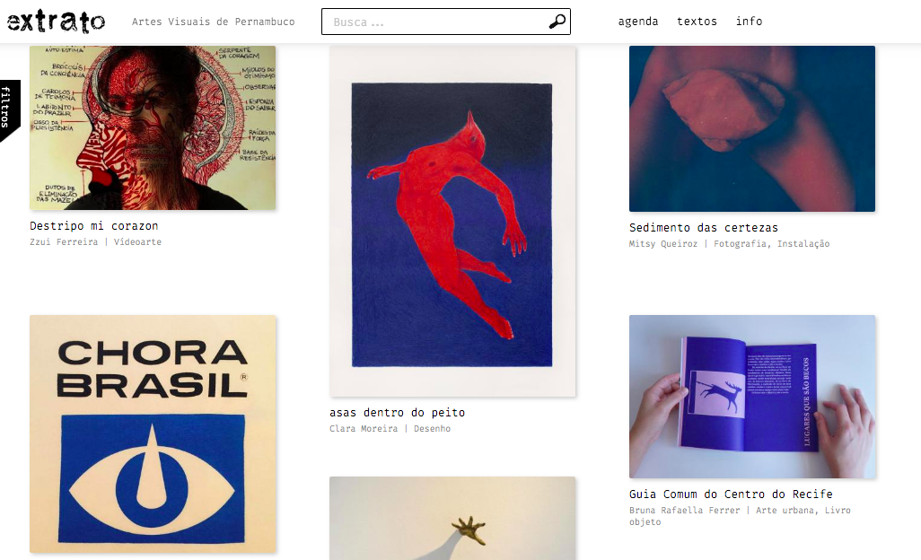 Um mapeamento interativo da produção pernambucana de artes visuais, feito a partir de um exercício de curadoria coletiva. A partir dessa proposta, acaba de ser lançada a plataforma Extrato (http://extrato.art), iniciativa de base tecnológica em que artistas podem criar e atualizar seus portfólios, compartilhar trabalhos, biografias e links da sua produção artística e publicar textos e eventos no campo da arte. Um happening de lançamento acontece no dia 10/12 (quinta-feira), às 20h. No encontro virtual que acontece dentro da própria plataforma, um vídeo chat promoverá a navegação e conversa entre equipe, artistas e público.