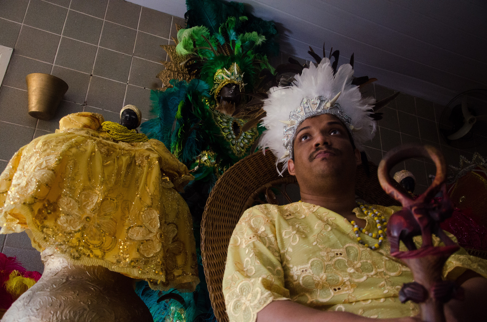 “A gente faz os figurinos na nossa própria sede. Primeiro a gente risca, cria todos os desenhos, depois confecciona os estandartes. É um investimento grande, de dinheiro e tempo”, conta Jefferson Nagô