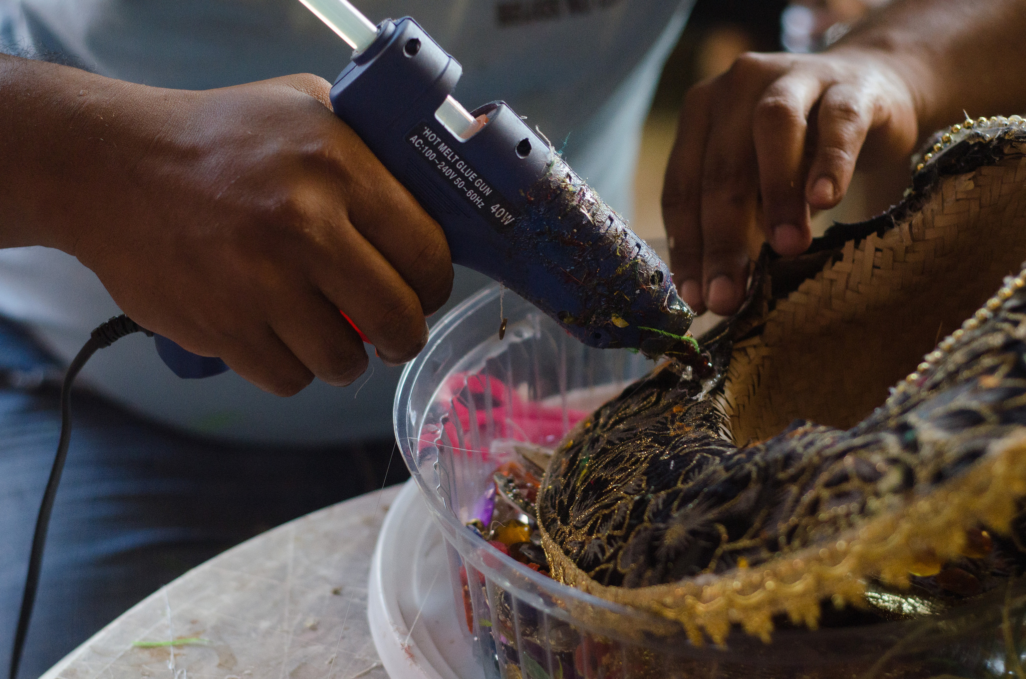 “A gente faz os figurinos na nossa própria sede. Primeiro a gente risca, cria todos os desenhos, depois confecciona os estandartes. É um investimento grande, de dinheiro e tempo. Para se der uma ideia, só a cabeça da fantasia leva no mínimo um mês pra ficar pronta, porque tem todo o acabamento, bordados e preparação da tinta pra pintar as plumas. Tem alguns capacetes que temos três penas diferentes, a chinchila, que é do pescoço do galo, o rabo do galo e uma pena de avestruz. Essa última é uma das mais caras, a unidade sai por R$ 25 e o quilo custa R$ 2.750. E com um quilo eu consigo apenas uma única fantasia. Aqui é difícil encontrar esse material e geralmente compramos de uma fazenda de Goiás ou do Rio Grande do Sul. Depois vem todo um processo de limpeza, porque elas chegam sujas. E tem que cuidar também de toda a parte fiscal, tem que pagar os impostos, porque se o IBAMA pega a gente com uma caixa dessas sem nota fiscal, por exemplo, é cadeia na certa”, conta Jefferson. Em seguida, o grupo penteia pena por pena, e depois pinta uma por uma para manter a tonalidade da cor em todas elas. “Fora que as lantejoulas são pregadas uma a uma, na agulha e na cola. Depois colocamos os adereços mais grosseiros, como os dentes”.