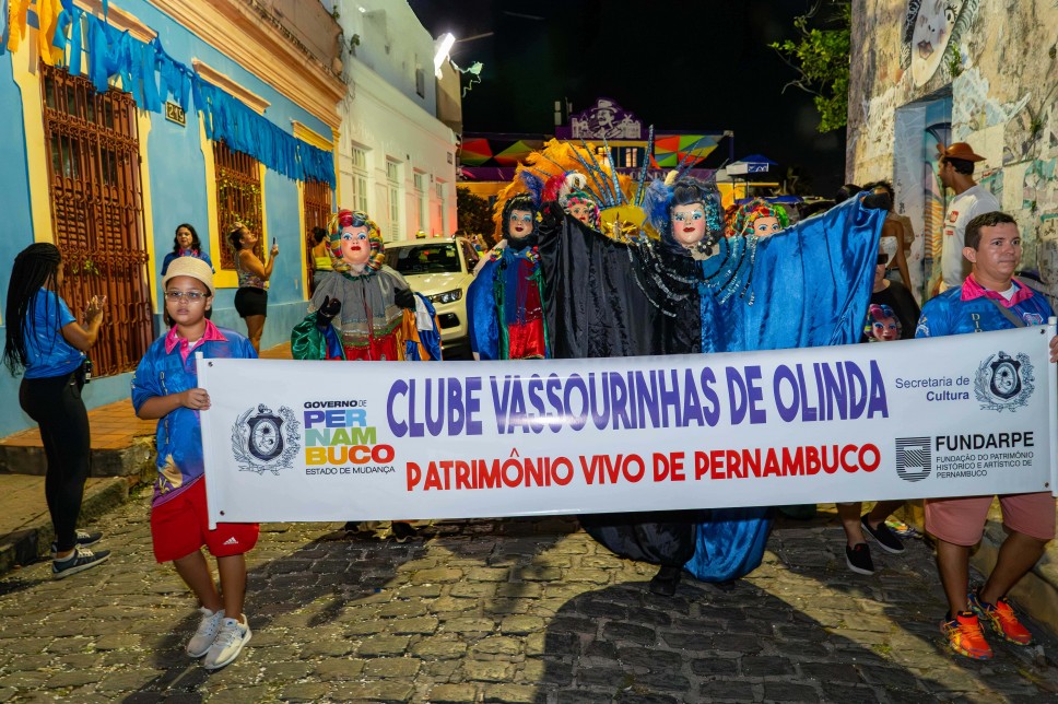 Já no cortejo Patrimônios Vivos de Pernambuco, agremiações tradicionais de Olinda como: Clube Carnavalesco Misto Elefante de Olinda, Clube Carnavalesco Vassourinhas de Olinda, Clube de Alegorias e Críticas O Homem da Meia-Noite, Troça Carnavalesca Mista Cariri Olindense e a Troça Carnavalesca Pitombeira dos Quatro Cantos caminharam até o palco principal acompanhados de bonecos gigantes e membros da orquestra e diretorias de cada conjunto.