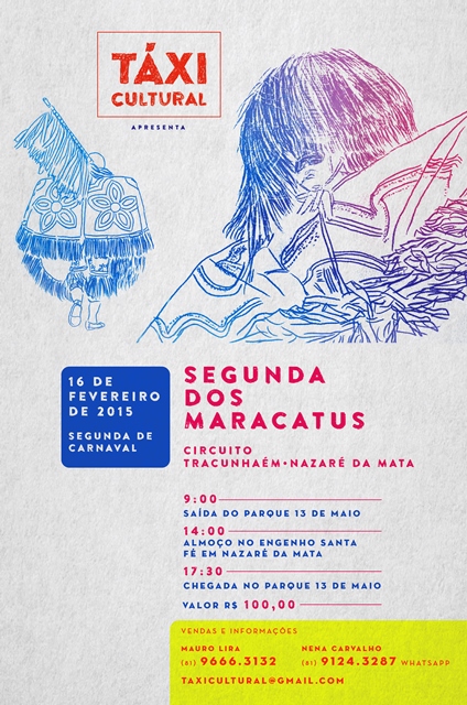 Ainda há vagas para a edição de Carnaval do projeto “Táxi Cultural”, umas das iniciativas vencedoras do Prêmio Brasil Criativo 2014. O roteiro da segunda-feira de Carnaval contempla encontros de maracatu das cidades de Tracunhaém e Nazaré da Mata. A saída será do Recife, às 9h.