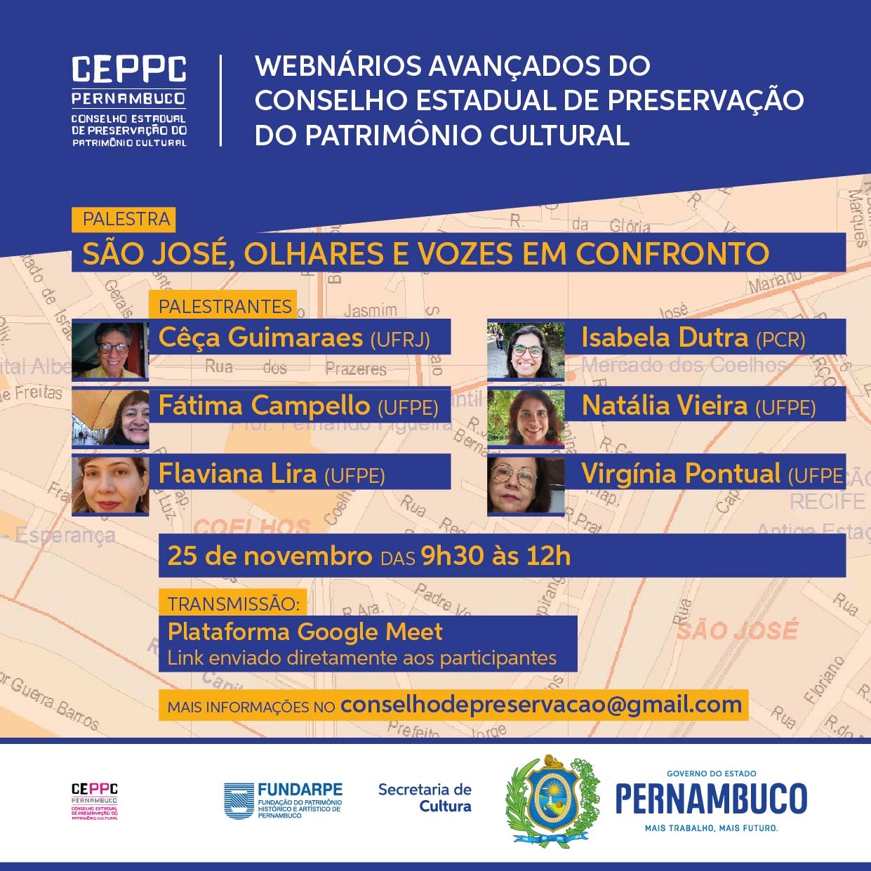 O Conselho Estadual de Preservação do Patrimônio Cultural de Pernambuco (CEPPC/PE) promove, nesta quinta-feira (25), o webnário “São José, Olhares e Vozes em Confronto”, sobre o livro recém lançado pela Companhia Editora de Pernambuco, e com a palestra de seis especialistas em arquitetura e urbanismo participantes da coletânea de artigos: Cêca Guimarães (UFRJ), Isabela Dutra (UFPE), Fátima Campello (UFPE), Flaviana Lira (UFPE) Natália Vieira (UFPE) e Virgínia Pontual (UFPE). O evento será transmitido das 9h às 12h30, via Google Meet.