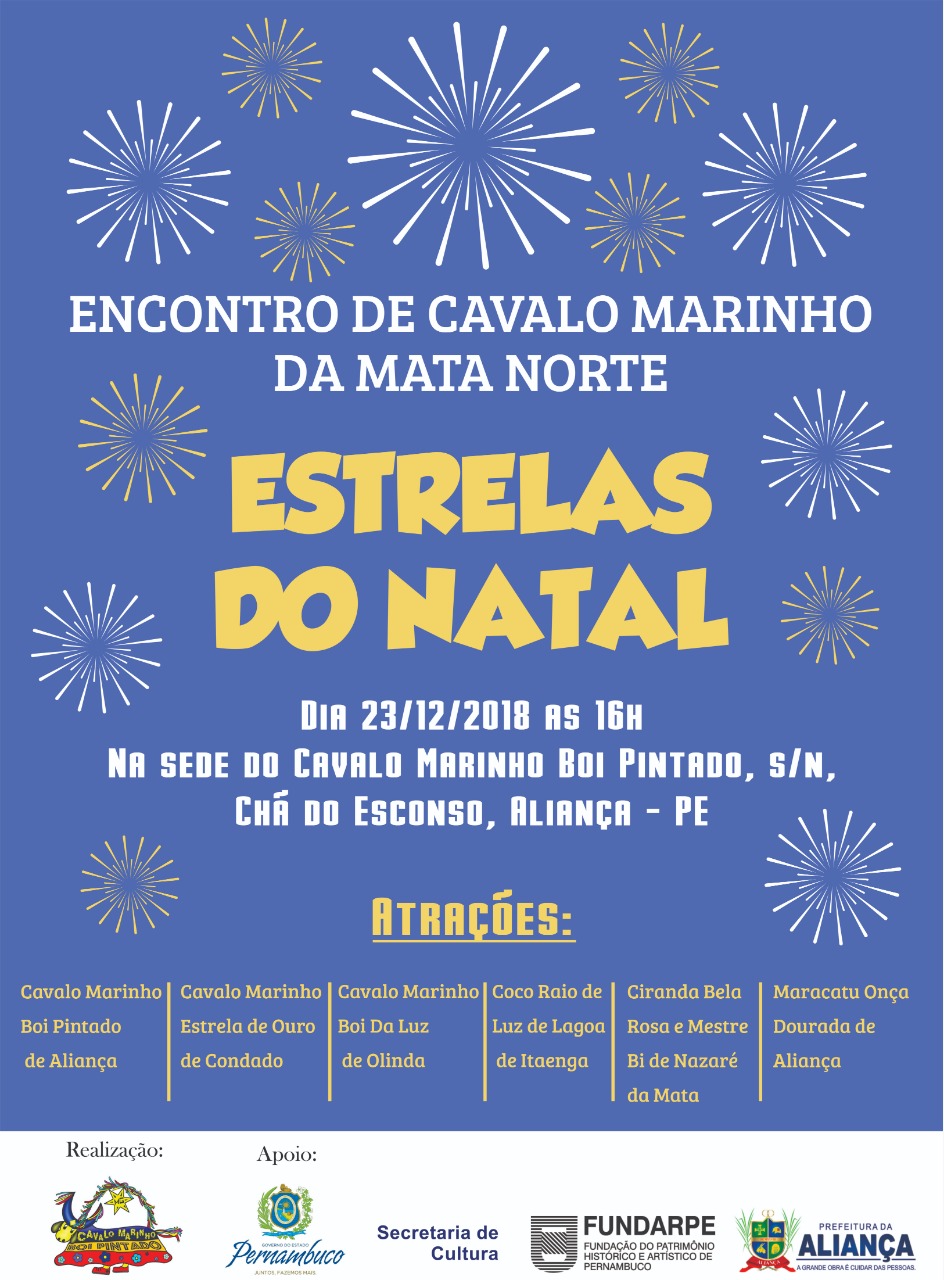Quem quiser celebrar o Natal com um toque mais pernambucano poderá assistir ao Encontro de Cavalo Marinho da Mata Norte, que acontece neste domingo (23), a partir das 16h, na Sede do Cavalo Marinho Boi Pintado. Além do anfitrião, a ocasião contará com apresentações do Cavalo Marinho Estrela de Ouro de Condado, Cavalo Marinho Boi da Luz de Olinda, Coco Raio de Luz de Itaenga, Ciranda Bela Rosa e Mestre Bi de Nazaré da Mata e Maracatu Onça Dourada de Aliança. A entrada é gratuita.
