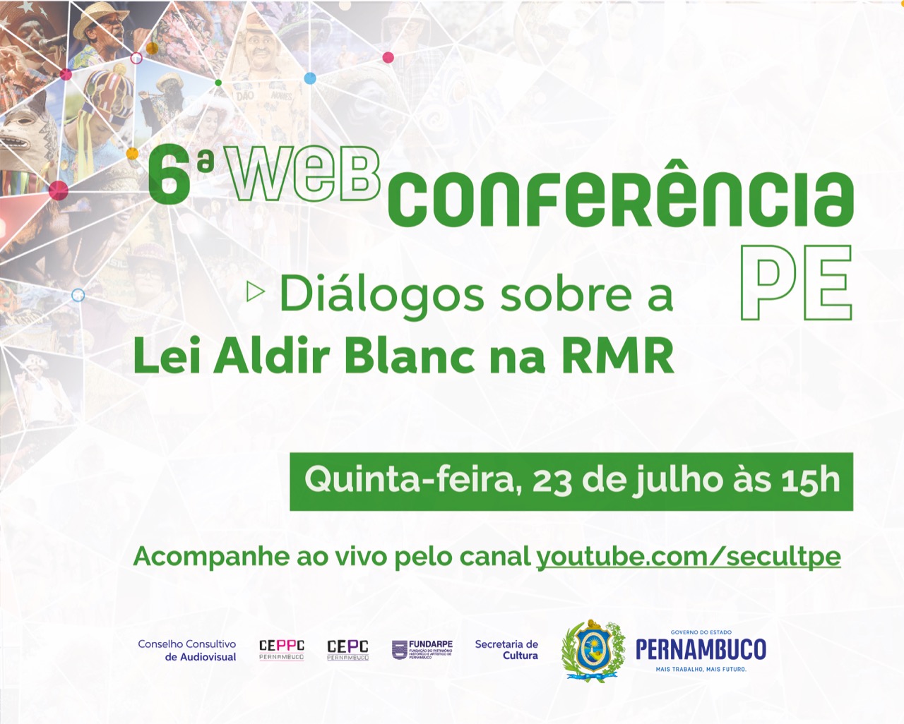 Nesta quinta-feira (23), a partir das 15h, gestores da Secult-PE e da Fundarpe promovem a 6ª Webconferência – Diálogos sobre a Lei Aldir Blanc com os municípios que integram a Região Metropolitana.  O objetivo é tirar dúvidas e promover pactuações em torno da execução da Lei 1.075/2020, que trata da destinação de recursos para serem aplicados em ações emergenciais da Cultura, mais conhecida como Lei Aldir Blanc.