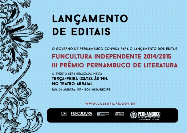 O Governo de Pernambuco vai realizar nesta terça-feira, 23/12, o lançamento de mais dois editais de fomento à Cultura Pernambucana: o edital do Funcultura Independente 2014/2015 e o do 3º Prêmio Pernambuco de Literatura.