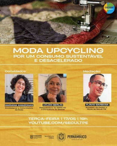 O assunto será tratado na live “Moda Upcycling: por um consumo sustentável e desacelerado”, nesta terça-feira (17), às 19h, no canal do Youtube da Secretaria de Cultura e da Fundarpe. A conversa será com Mariana Amazonas, ecodesigner e uma das sócias do coletivo A Roda (@vem.pra.roda), uma iniciativa que nasce com propósito de criar formas regenerativas de consumir moda. Também participa da live a socióloga Lylian Berlim, autora do livro “Moda e Sustentabilidade”, uma reflexão necessária e de capítulos de livros e artigos científicos dentro deste escopo. Lylian é consultora de sustentabilidade e novos negócios em moda no Sebrae. A mediação da live será do assessor de Design e Moda da Secretaria de Cultura de Pernambuco, Flávio Barbosa.