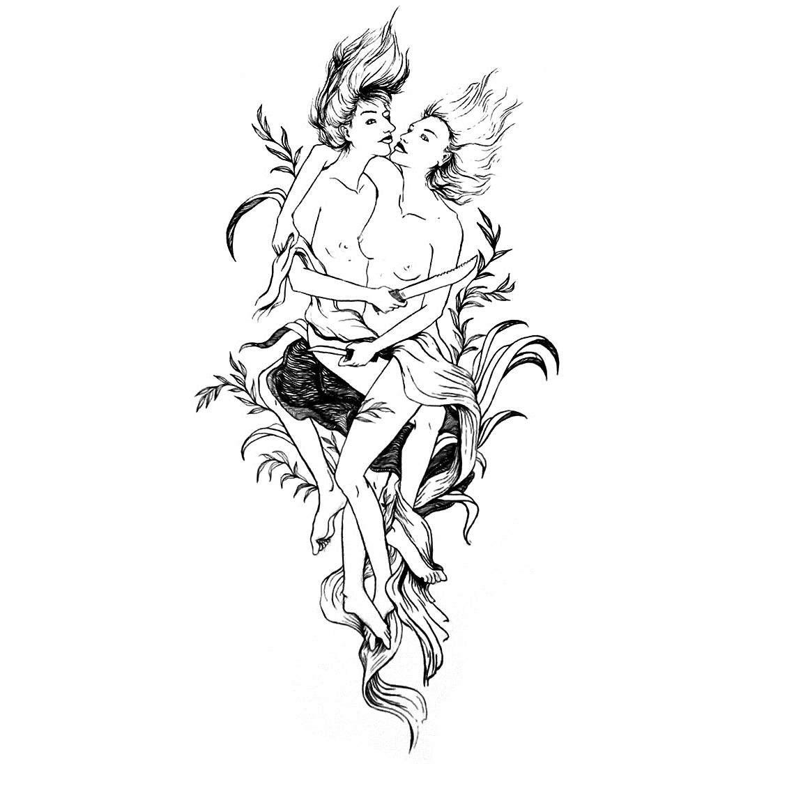Já a ilustradora Nathalia Queiroz, de 31 anos, participa pela terceira vez da mostra Delas, desta vez, com a peça ‘Bélica’, um desenho feito com nanquim sobre papel, produzida por ela no ano passado. “Essa ilustração mostra duas mulheres abraçadas, como se fossem um casal, mas que seguram armas. O que me inspirou a criar este desenho foi uma situação recorrente que acontecia quando eu namorava uma menina e a gente se abraçava publicamente como um casal normal. Era comum alguém soltar uma gracinha, como se as duas juntas fossem um combo e não um casal que quisesse estar junto, e aquilo muito me irritava. Mulheres que se amam, mas que precisam andar armadas o tempo todo”.