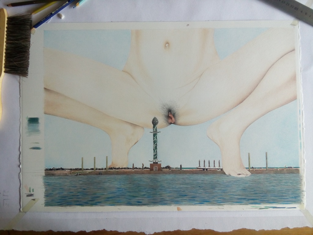 Uma das artistas participantes, Clara Moreira, de 33 anos, é autora de uma peça sem título, um desenho 35x51cm, feito em lápis de cor em papel-algodão. A obra ilustra uma espécie de intervenção na paisagem do Parque das Esculturas do Recife, no qual o corpo de uma mulher se sobrepõe ao objeto fálico batizado por Francisco Brennnand de Torre de Cristal.