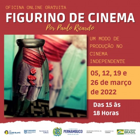 Estão abertas as inscrições para a “Oficina Figurino: um modo de produção do cinema independente”, que o figurinista Paulo Ricardo vai comandar virtualmente entre os dias 5, 12, 19 e 26 de março (sábados), das 15h às 18h. Os interessados poderão se inscrever gratuitamente até o próximo dia 28 de fevereiro (segunda-feira), por meio do formulário: bit.ly/36045jx. Serão ofertadas 15 vagas. A atividade conta com os recursos da Lei Aldir Blanc em Pernambuco.