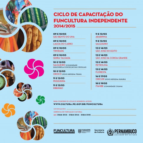 O Governo do Estado, através da Secretaria de Cultura e da Fundação do Patrimônio Histórico e Artístico de Pernambuco (Fundarpe), inicia na próxima segunda-feira (09/03) o ciclo de capacitação do Edital Funcultura Independente 2014/2015. As oficinas serão realizadas em todas as Regiões de Desenvolvimento do Estado. Ao todo, serão 29 capacitações para orientar artistas, produtores, pesquisadores e educadores que desejam elaborar projetos para a seleção pública. Confira a PROGRAMACAO das oficinas, que serão realizadas na Região Metropolitana do Recife, Zona da Mata, Agreste e Sertão, incluindo comunidades indígenas e quilombolas. As oficinas são gratuitas e não necessitam de inscrição prévia.