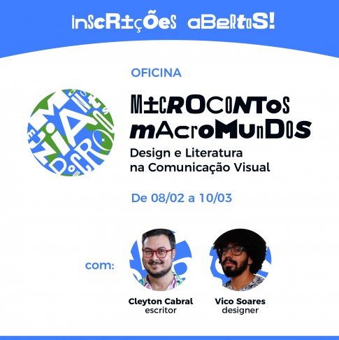Estão abertas as inscrições para a oficina “Microcontos, Macromundos: Design e Literatura na comunicação visual”, que será ministrada gratuitamente pelo escritor Cleyton Cabral, em parceria com o designer gráfico Vico Soares, entre os dias 8 de fevereiro a 10 de março de 2022, por meio da plataforma Zoom. Para se inscrever na atividade, que foi contemplada pelos recursos da Lei Aldir Blanc em Pernambuco, basta preencher o formulário disponível no link: forms.gle/pgL9bPdjX9iix2S86. Os interessados poderão se inscrever até o dia 2 de fevereiro (quarta-feira).