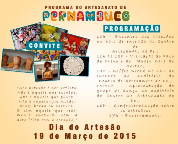 Entre as comemorações que irão marcar o Dia do Artesão nesta quinta-feira (19), tanto o Centro do Artesanato de Pernambuco – unidade do Recife, como o Museu Cais do Sertão, estarão com programações especiais. A partir das 10h, acontece o encontro de artesãos no hall do Centro de Artesanato, que é aberto à categoria do Estado que tiver interesse em participar.