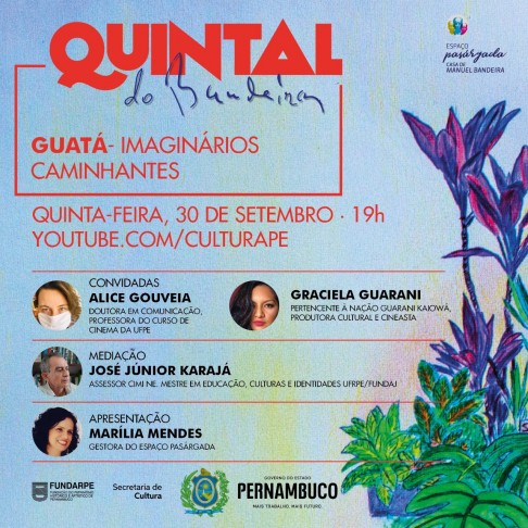 Vai ao ar nesta quinta-feira (30) mais uma edição do Quintal do Bandeira, série de encontros virtuais organizados pelo Espaço Pasárgada, equipamento cultural gerenciado pela Secult-PE/Fundarpe. “GUATÁ- imaginários caminhantes” é o tema da conversa que abordará o universo do cinema indígena e sua cultura em Pernambuco e no Brasil. A transmissão será às 19h, no canal youtube.com/SecultPE. O acesso é gratuito.