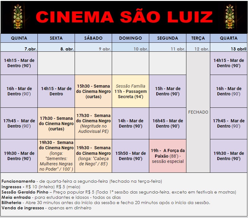 O Cinema São Luiz vai sediar a 3ª Semana do Audiovisual Negro, com entrada franca ao público que for conferir as exibições na sexta-feira (8) e no sábado (9). A mostra se estende até o próximo dia 12 e está estruturada para acontecer em três locais na cidade do Recife. Além do São Luiz, o Cine Teatro do Parque e o Cine UFPE também recebem a programação, que se estende até o dia 12.