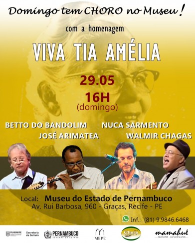 HOMENAGEADA - Nascida em 25 de maio de 1897, Tia Amélia foi contemporânea de João Pernambuco, Chiquinha Gonzaga, Antônio Callado, Pixinguinha e tantos outros ícones do ritmo do choro no século passado. Pioneira, ela ainda é pouco conhecida pelo grande público, que poderá conhecer no show suas composições. Parentes de Tia Amélia estarão presentes no evento e vão participar de uma conversa com o público sobre a vida desse ícone da música pernambucana.