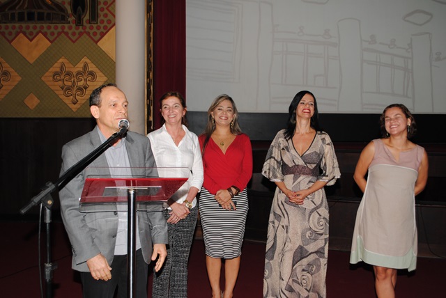 O secretário de cultura Marcelino Granja saudou o público ao lado de Márcia Souto, presidente da Fundarpe; de Iana Marques (Prefeitura do Recife); a cerimonialista Marília Mendes e de Milena Evangelista, coordenadora do FestCine