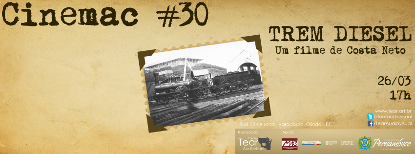 O Coletivo Tear Audiovisual e o Museu de Arte Contemporânea de Pernambuco promovem neste sábado (26), às 18h, a trigésima edição do projeto CineMAC Tear. Na ocasião será exibido o curta-metragem ‘Trem Diesel’, do diretor Costa Neto, que conversará com o público a respeito do trabalho após a sessão. A entrada é gratuita.