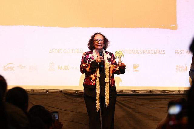 Em discurso emocionado, a paraibana com quase 60 anos de carreira no teatro, no cinema e na televisão, reverenciou o poder da arte transformadora: “Não me interessa a arte pela arte, mas a arte que modifica as pessoas, a arte com conteúdo que sirva para dizer que, nesse país, nós temos esperança”. Lembrando o inicio da sua trajetória, em 1958, Zezita agradeceu a homenagem “em terra estranha, terra que não é minha”, destacando que a honraria não lhe deixa “envaidecida, mas com ainda mais responsabilidade de, como operária da arte, dar sempre o melhor”. Demonstrando empatia e jogando luz sobre uma questão urgente para o cinema brasileiro, a atriz dedicou a honraria “a todas as mulheres que um dia desejaram fazer arte e não puderam”.