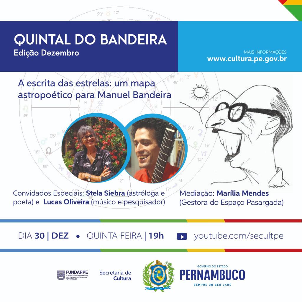 “A escrita das estrelas: um mapa astropoético para Manuel Bandeira”. É com esse tema que vai ao ar, nesta quinta-feira (30), a live do projeto “Quintal do Bandeira”, promovido pelo Espaço Pasárgada. A transmissão será a partir das 19h, no canal do Youtube da Secretaria de Cultura de Pernambuco (Secult-PE), youtube.com/SecultPE. Durante a interpretação do mapa astral do poeta modernista, patrono do equipamento cultural, serão declamados poemas para ilustrar as sinalizações celestes indicadas na constelação de Bandeira.