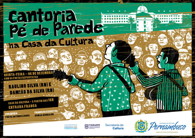 O projeto Cantoria Pé de Parede, que conta com incentivo do Governo do Estado, por meio dos recursos do Funcultura, recebe nesta quinta-feira (6), na Casa da Cultura, os repentistas Raulino Silva e Damião da Silva. Vindos do Rio Grande do Norte, no palco, os poetas os artistas vão cantar versos de improviso e interagir com o público, a partir de temas atuais como assuntos políticos, econômicos e sociais do Brasil, do mundo e aspectos da vida do homem nordestino. A apresentação é gratuita e começa a partir das 16h.