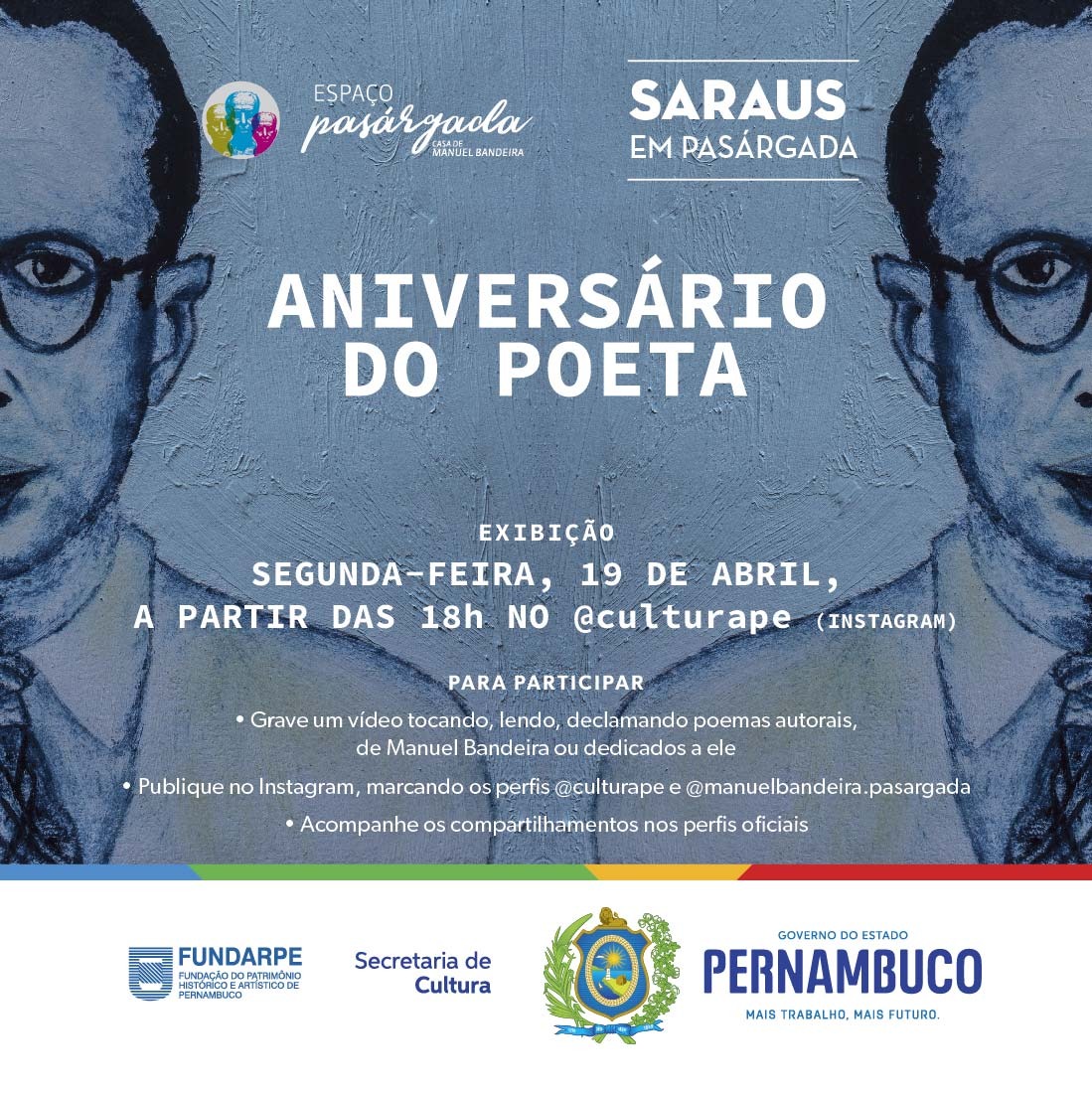 Abril é o mês em que Saraus em Pasárgada vai acontecer na data de aniversário de Manuel Bandeira, o grande anfitrião do evento durante todo o ano. Com o tema “Aniversário do Poeta”, a noite do dia 19 de abril, segunda, será de festa, regada a muita poesia. A participação é aberta a todos, no Instagram, com exibição a partir das 18h, no @culturape.