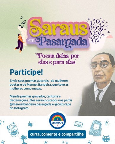 O Saraus em Pasárgada deste mês de março vai ser todo dedicado para a “Poesia delas, por elas e para elas”. Na edição especial do Dia da Mulher, nesta sexta-feira (10), o chamado é para as fazedoras de versos e as apaixonadas por poesias gravem seus vídeos declamando e os enviem para os perfis do Espaço Pasárgada (@manuelbandeira.pasargada) e do Cultura PE (@culturape). De forma colaborativa e virtual, todo mundo tem acesso a doses poéticas.