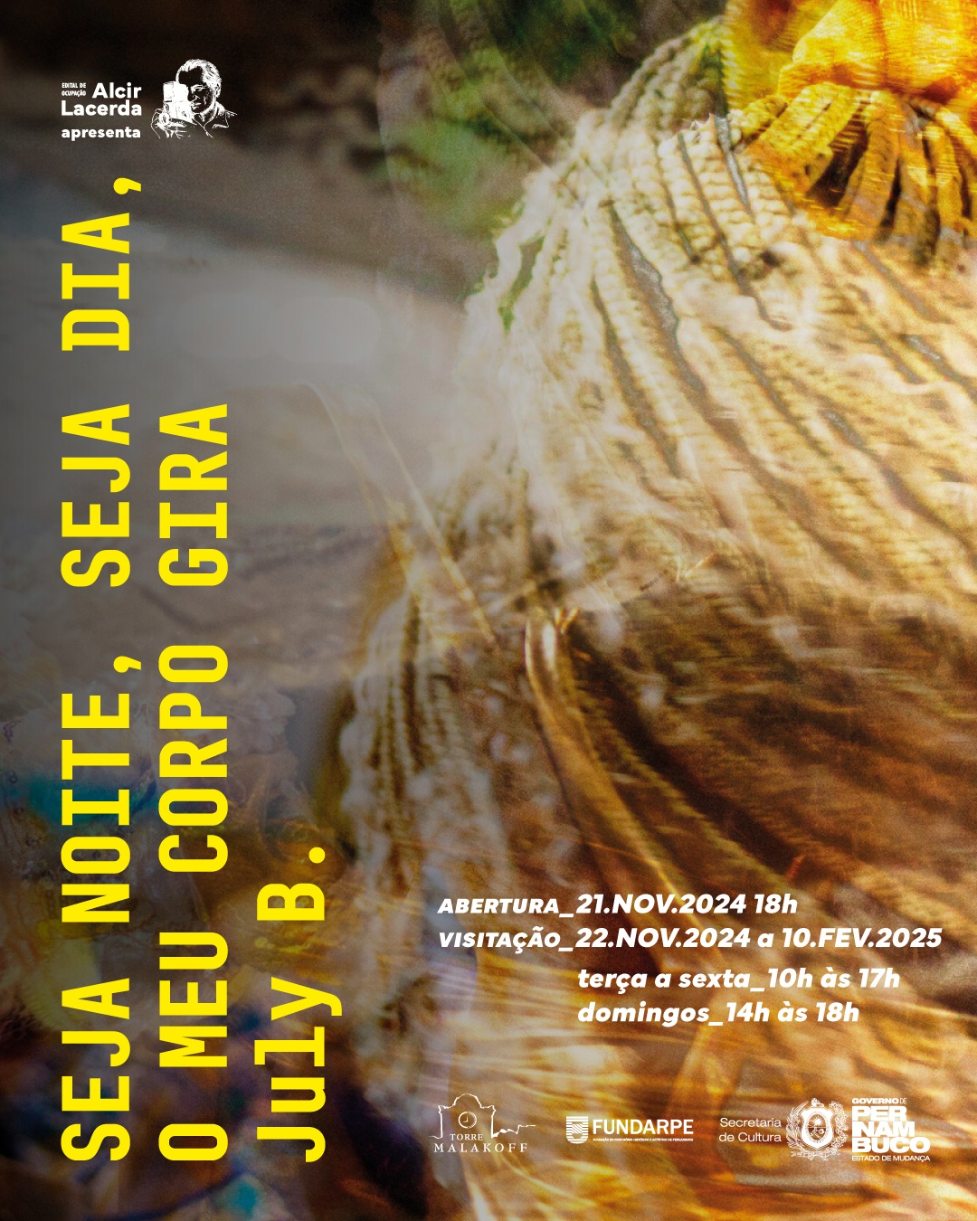 O Observatório Cultural Torre Malakoff (Praça do Arsenal da Marinha, s/nº, Bairro do Recife) inaugura, nesta quinta-feira (21), às 18h, a exposição Seja Noite, Seja Dia, Meu Corpo Gira, do artista visual July B. O ensaio foi o grande vencedor do edital Ocupação da Sala Alcir Lacerda. A abertura para o público acontece nesta sexta-feira (22) e vai até o dia 10 de fevereiro de 2025. A visitação ocorre de terça a sexta-feira, das 10h às 17h; e aos domingos, das 14h às 18h.