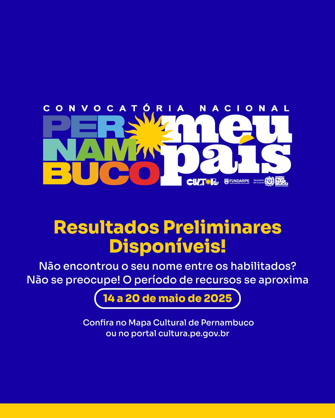 Os resultados dos habilitados e inabilitados podem ser conferido por meio da plataforma do Mapa Cultural de Pernambuco, na página do edital. Para os proponentes inabilitados, o período para envio de recursos será de 14 a 20 de maio de 2025, exclusivamente por meio da mesma plataforma.