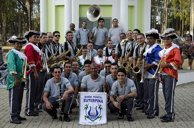 Era fim de tarde e o grupo – apenas parte dele, 29 integrantes, na verdade, uma vez que os empregos “convencionais” não permitiram ausência, mesmo que temporária, dos demais – seguiu em um cortejo rápido pelo Euclides Dourado. Rápido, mas o suficiente para chamar a atenção de algumas pessoas em volta, que a acompanharam até o Espaço Mamulengo e Pontos de Cultura, dentro do parque, para assistir à sua apresentação, se acomodando nas cadeiras dispostas no local. “O artista precisa do público. Por mais que ele ganhe milhões, o que vai dar a ele aquela satisfação é a presença do público, prestigiando-o”, disse o presidente da Euterpina, Eder Gomes da Costa, que se dizia surpreso, pois não imaginava que, num dia de semana, em horário comercial, haveria público para a apresentação.