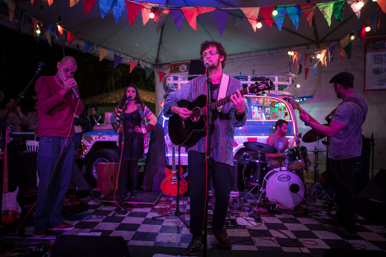 No mesmo dia, Petrônio agregou uma outra experiência a sua participação no FIG. Se apresentou com sua banda no Som da Rural, no Parque Euclides Dourado. Apesar de serem duas experiências diferentes dentro de um mesmo festival, ele considera que os trabalhos estão interligados, sobretudo pelo fato do repertório do show ser, em parte, a trilha sonora do filme, que, inclusive, foi reconhecida no circuito competitivo. “Quando eu ensaio menos, tento desenvolver uma segurança pra improvisar e assim poder conciliar os trabalhos. Já toquei algumas vezes no Som da Rural, mas no FIG é a primeira vez. Isso é muito bom porque meu trabalho chega em outras cidades, sobretudo no interior. É massa pra pessoas não acharem que certas culturas ficam somente na capital”.