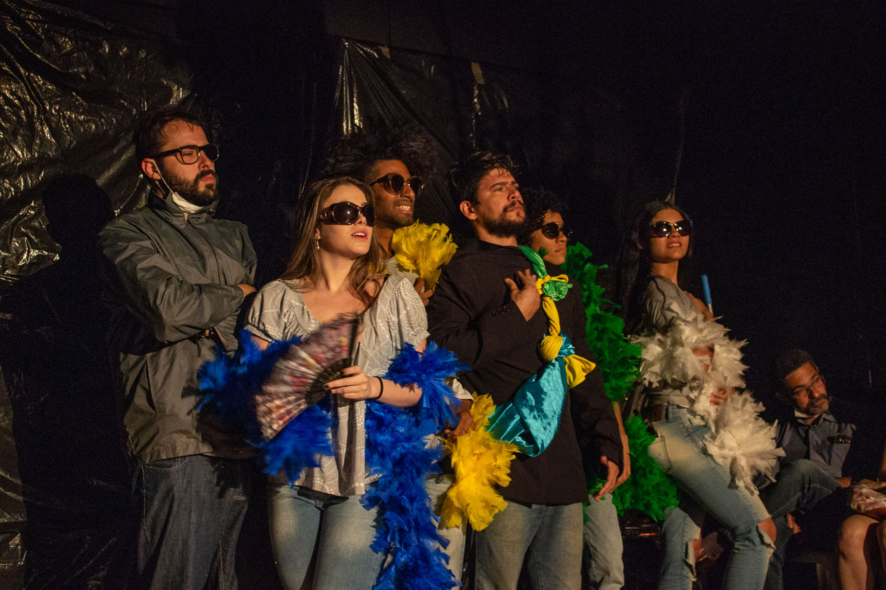 Narrativa apresentada por duas personagens que trazem lembranças saudosas de entes queridos que partiram, em meio a conflitos e tumultos no cemitério, onde acontece uma greve de coveiros. É nesse contexto de encontros e conversas do cotidiano, que surgem revelações que sufocam o imaginário social, dividindo uma bandeira, que não é patriota, e sim, de uma subjetividade individual de quem partiu e deixou mágoas eternas. Deixamos em aberto esse argumento temático a ser debatido com o público. Construída a partir do olhar e dos sentimentos da personagem, permite, em determinado domínio da linguagem, certas soluções estéticas que podem ser consideradas não realistas, e que recaem por vezes sobre a poesia visual, que estimula a discussão. E nesse texto desconexo da autora, em meio a graves tumultos e aflições das perdas familiares, que nos equilibramos para mergulharmos nas questões tão contundentes quanto atuais. Absurdas são as relações sociais provocando agitações em meio a falas fragmentadas diante do sentimento. Apresentamos uma linguagem simples que possibilita aos atores extrair das palavras a sua expressão fora da palavra, de desenvolvimento no espaço de ação, às vezes dissociada de imagens, porem vibratória sobre a sensibilidade, que colocamos no jogo cênico com musicas e audiovisual.