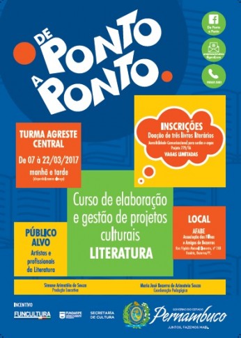 Estão abertas as inscrições para o curso De ponto a ponto, que tem a proposta de formar até 40 profissionais da área de literatura na elaboração e gerenciamento de projetos no Agreste de Pernambuco. A ideia, de acordo com Simone Arimateia, produtora do projeto, é fomentar a criação de um núcleo de produtores culturais na região.