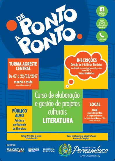 Estão abertas as inscrições para o curso De ponto a ponto, que tem a proposta de formar até 40 profissionais da área de literatura na elaboração e gerenciamento de projetos no Agreste de Pernambuco. A ideia, de acordo com Simone Arimateia, produtora do projeto, é fomentar a criação de um núcleo de produtores culturais na região.