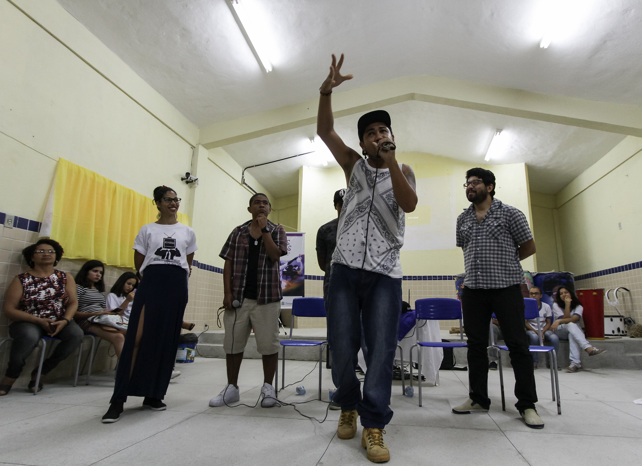 Durante a conversa com a banda, o aluno Breno da Silva pediu novamente a fala e disse que gostava de escrever e cantar rap romântico, e que algumas pessoas o haviam desencorajado a correr atrás. “Queria saber como vocês lidaram com essa situação?”, questionou o jovem. “Dê graças a Deus que você tem voz, porque muita gente queria ter e não tem”, aconselhou o MC Af.  “No começo da banda foi difícil e é até hoje. Quando eu comecei a escrever letras com quinze anos eu mostrava ao meu irmão. Eu tinha que colocar aquilo pra fora e precisava mostrar a alguém. Mas vejam como são as coisas. Depois eu descobri que ele chegava para o pessoal na rua e dizia que achava que eu estava enlouquecendo, que eu estava com um papo de doido que tinha virado músico. Mas ele nunca me desencorajou diretamente. O que aconteceu depois de um tempo foi que uns amigos montaram uma banda de rock, na Bomba do Hemetério, para participar de um festival, mas eles não tinham música letrada. Ai me chamaram e disseram que estavam sabendo que eu havia escrito algumas canções e que queriam ouvir. Resultado: depois de ouvirem, eu acabei entrando pra banda e passei três anos nela, um grupo bem legal de Casa Amarela que se chama Gravidade Zero. E foi através do baixista que eu conheci Gão. Pra você ver como as coisas estão conectadas. Se eu tivesse desistido ali atrás, eu não estaria conversando com você agora. Sempre vá aperfeiçoar. Se você tiver que ser alguém, seja o melhor, sem desmerecer os outros”.