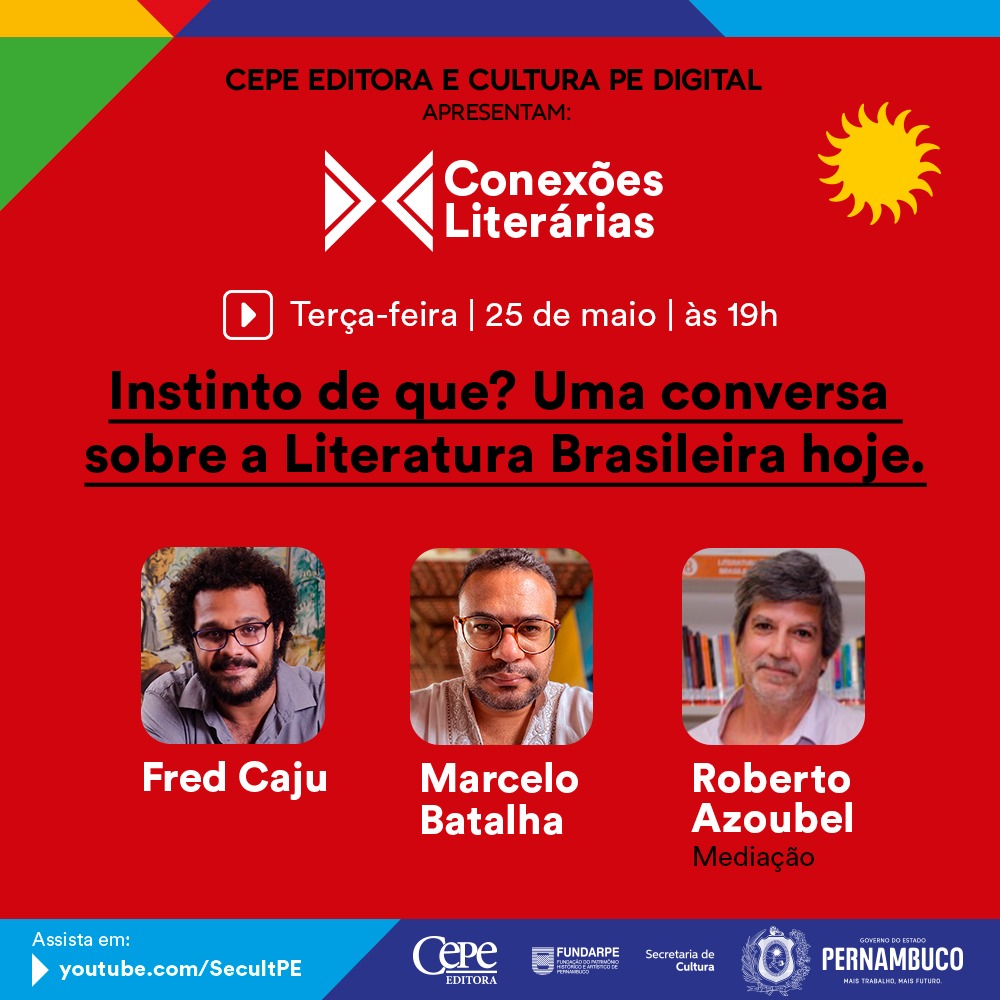 Participam do encontro on-line: Fred Caju, escritor e editor, e Marcelo Batalha, mestre em Educação, Culturas e Identidades (UFRPE/Fundaj) e especialista em Linguística e Ensino do Português (UFPE). Quem media a conversa é Roberto Azoubel, coordenador de Literatura da Secult-PE. Na pauta, questões como os elementos que definiriam a literatura brasileira contemporânea e seu papel na chamada identidade nacional.