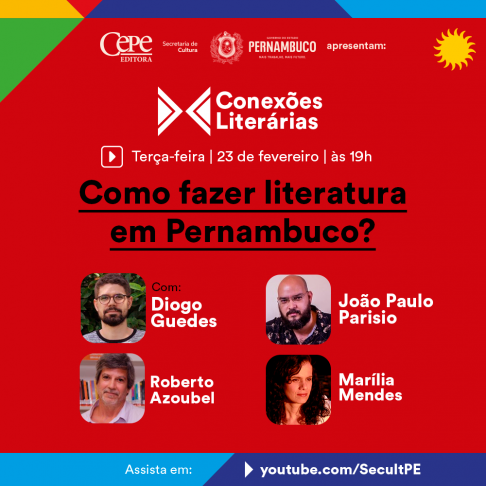 O “Conexões Literárias”, web programa cultural produzido mensalmente pela Cepe Editora, retoma sua temporada em 2021, com novidades. A partir de sua edição de fevereiro, já marcada para acontecer na próxima terça-feira (23), às 19h, ele passa a ser correalizado pela Secretaria de Cultura de Pernambuco (Secult-PE). Mantendo a mesma proposta de oferecer uma boa conversa sobre livros e o mundo literário, a live reunirá o coordenador de Literatura da Secult-PE, Roberto Azoubel; a gestora do Espaço Pasárgada, Marília Mendes; o editor da Cepe, Diogo Guedes; e o escritor José Paulo Parisio, em torno do tema “Como fazer literatura em Pernambuco?”. O programa será transmitido simultaneamente pelos canais da Secult-PE e da Cepe Editora, no YouTube.