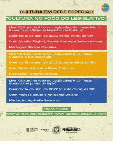 LIVES - Para debater a nova conjuntura criada pela aprovação dessas leis, que trazem mudanças estruturadoras para as políticas públicas de Cultura no Brasil, a Secretaria de Cultura de Pernambuco (Secult-PE) e a Fundação do Patrimônio Histórico e Artístico de Pernambuco (Fundarpe) promoverão uma série de três lives “CULTURA NO FOCO DO LEGISLATIVO”, que serão transmitidas nos dias 12, 13 e 14 de abril (terça, quarta e quinta-feira), sempre às 19h, no canal: youtube.com/SecultPE.