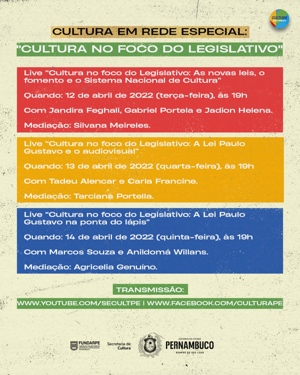 LIVES - Para debater a nova conjuntura criada pela aprovação dessas leis, que trazem mudanças estruturadoras para as políticas públicas de Cultura no Brasil, a Secretaria de Cultura de Pernambuco (Secult-PE) e a Fundação do Patrimônio Histórico e Artístico de Pernambuco (Fundarpe) promoverão uma série de três lives “CULTURA NO FOCO DO LEGISLATIVO”, que serão transmitidas nos dias 12, 13 e 14 de abril (terça, quarta e quinta-feira), sempre às 19h, no canal: youtube.com/SecultPE.