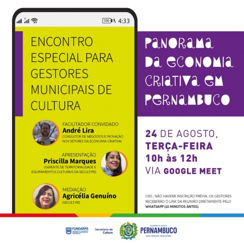 Além disso, a programação desta semana dos encontros com os gestores municipais de cultura contará, na quinta-feira (26) e na próxima terça-feira (31), com um passo a passo de como lançar um edital no Mapa Cultural de Pernambuco (www.mapacultural.pe.gov.br), plataforma gerida pela Secult-PE que vai ancorar os próximos editais da Lei Aldir Blanc no Estado.
