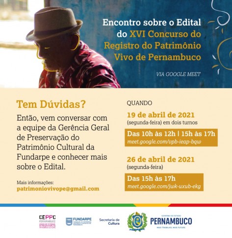 A Gerência-Geral de Preservação do Patrimônio Cultural (GGPPC) da Fundarpe promove, nos dias 19 de abril (das 10h às 12h e das 15h às 17h) e 26 de abril (das 15h às 17h), dois encontros virtuais para tirar dúvidas sobre a inscrição de candidaturas interessadas em concorrer ao Registro do Patrimônio Vivo do Estado de Pernambuco (RPV-PE). O edital do RPV-PE, que esse ano chega à sua 16ª edição, apresenta como principal mudança o formato de recebimento das inscrições, que devem ser feita exclusivamente on-line por meio da Plataforma Prosas (prosas.com.br).