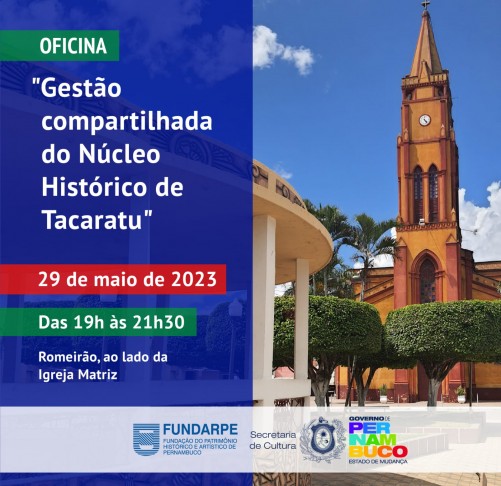 A Fundação do Patrimônio Histórico e Artístico de Pernambuco (Fundarpe) promove, nesta segunda-feira (29), a oficina “Gestão compartilhada do Núcleo Histórico de Tacaratu”. O encontro, que terá como foco a identificação de referências culturais do município localizado no Sertão do Estado, será realizada no horário das 19h às 21h30, no Romeirão. A entrada é gratuita e para participar basta comparecer ao local.