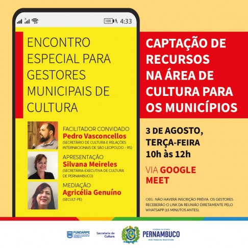 A Secretaria de Cultura de Pernambuco (Secult-PE) promove nesta terça-feira (3), a partir das 10h, mais uma edição especial dos Encontros com Gestores Municipais. Dessa vez, o evento virtual, que integra o calendário semanal de atividades da Secult-PE, tratará sobre o tema “Captação de recursos na área de cultura para os municípios” e contará com a participação do secretário de Cultura e Relações Internacionais da cidade de São Leopoldo (RS), Pedro Vasconcellos; apresentação da Secretária-Executiva de Cultura de Pernambuco, Silvana Meireles; e mediação de Agricélia Genuíno (coordenadora de Apoio aos Municípios da Secult-PE).