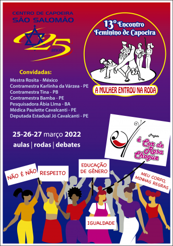 Estão abertas as inscrições para o “Encontro Feminino de Capoeira: a mulher entrou na roda”, que o Centro de Capoeira São Salomão promoverá entre os dias 25, 26 e 27 de março, com atividades presenciais e virtuais. As inscrições podem ser feitas no link: sites.google.com/view/encontrosdecapoeirasosalomo/11-encontro-feminino.