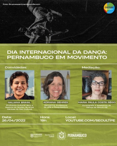 Nas vésperas do Dia Internacional da Dança, celebrado em todo mundo em 29 de abril, o programa Cultura em Rede, uma realização da Secretaria de Cultura de Pernambuco (Secult-PE) e da Fundação do Patrimônio Histórico e Artístico de Pernambuco (Fundarpe), apresentará uma live cujo tema é “Dia Internacional da Dança – Pernambuco em movimento”. O programa, que contará com a participação de Adriana Gehres (UPE), Galiana Brasil (Itaú Cultural) e mediação de Maria Paula Costa Rêgo (Secult-PE), será transmitido no canal da Secult-PE/Fundarpe no Youtube, com retransmissão no Facebook, na próxima terça-feira (26), às 19h.
